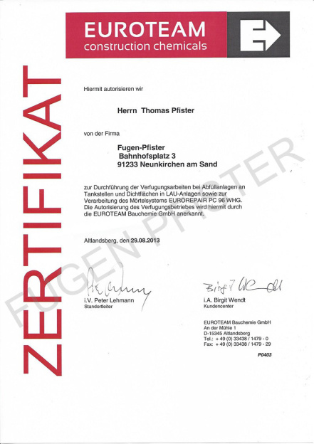 Zertifikat Euroteam autorisierter Bauchemie-Fachbetrieb
