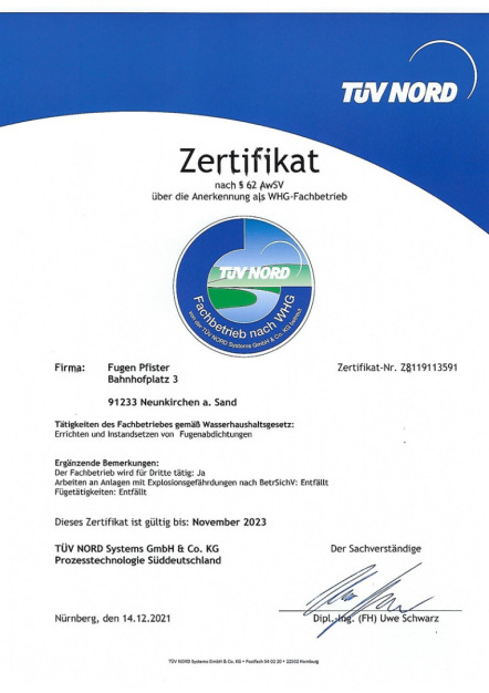 Zertifikat WHG gültig bis Nov 2023