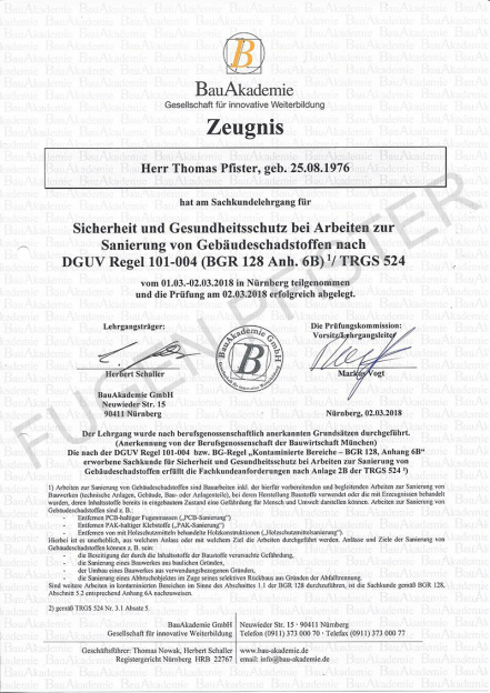 Zertifikat Sanierung v. Gebäudeschadstoffen nach DGUV Regel 101-004