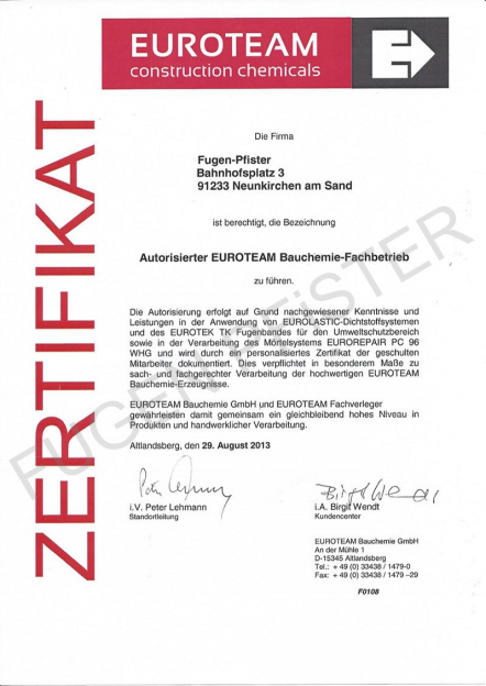 Zertifikat Euroteam autorisierter Bauchemie-Fachbetrieb